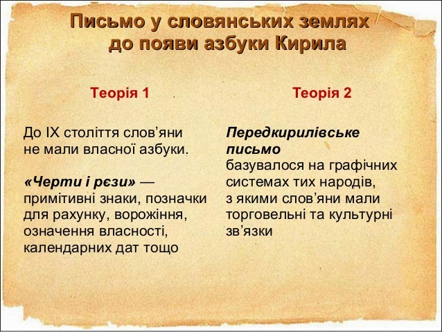 20. 20. Письмо у словянських земляхПисьмо у словянських землях додо появи азбуки Кирилапояви азбуки Кирила Теорія 1 Теорія 2 До ІХ століття слов’яни не мали власної азбуки. «Черти і рєзи» — примітивні знаки, позначки для рахунку, ворожіння, означення власності, календарних дат тощо Передкирилівське письмо базувалося на графічних системах тих народів, з якими слов’яни мали торговельні та культурні зв’язки