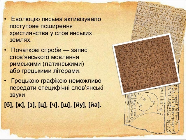 21. 21. • Еволюцію письма активізувало поступове поширення християнства у слов’янських землях. • Початкові спроби — запис слов’янського мовлення римськими (латинськими) або грецькими літерами. • Грецькою графікою неможливо передати специфічні слов’янські звуки [б], [ж], [з], [ц], [ч], [ш], [йу], [йа].