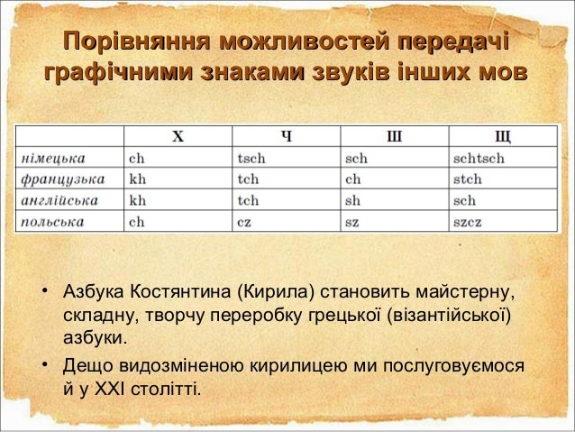 26. 26. Порівняння можливостей передачіПорівняння можливостей передачі графічними знаками звуків інших мовграфічними знаками звуків інших мов • Азбука Костянтина (Кирила) становить майстерну, складну, творчу переробку грецької (візантійської) азбуки. • Дещо видозміненою кирилицею ми послуговуємося й у XXI столітті.