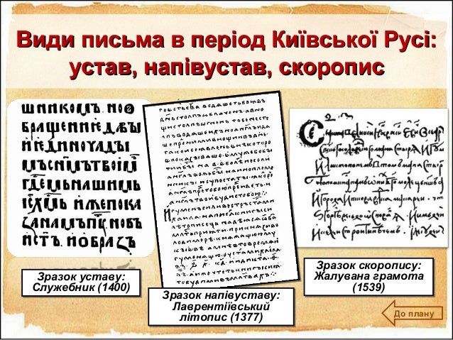 27. 27. Види письма в період Київської Русі:Види письма в період Київської Русі: устав, напівустав, скорописустав, напівустав, скоропис До плану Зразок напівуставу: Лаврентіївський літопис (1377) Зразок напівуставу: Лаврентіївський літопис (1377) Зразок скоропису: Жалувана грамота (1539) Зразок скоропису: Жалувана грамота (1539) Зразок уставу: Служебник (1400) Зразок уставу: Служебник (1400)
