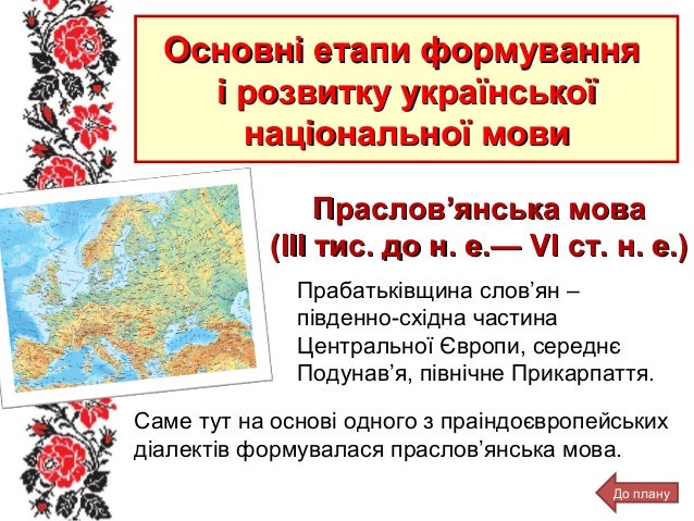 2. 2. Основні етапи формуванняОсновні етапи формування і розвитку українськоїі розвитку української національної мовинаціональної мови Праслов’янська моваПраслов’янська мова (III тис. до н. е.— VІ ст. н. е.)(III тис. до н. е.— VІ ст. н. е.) Саме тут на основі одного з праіндоєвропейських діалектів формувалася праслов’янська мова. До плану Прабатьківщина слов’ян – південно-східна частина Центральної Європи, середнє Подунав’я, північне Прикарпаття.