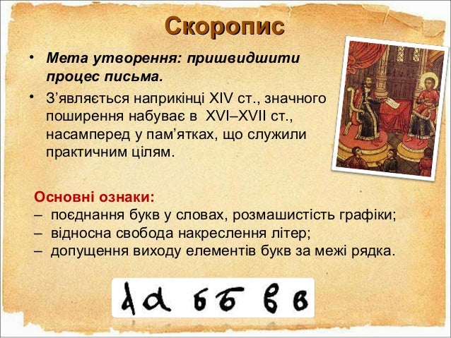 30. 30. СкорописСкоропис Основні ознаки: – поєднання букв у словах, розмашистість графіки; – відносна свобода накреслення літер; – допущення виходу елементів букв за межі рядка. • Мета утворення: пришвидшити процес письма. • З’являється наприкінці XIV ст., значного поширення набуває в XVI–XVII ст., насамперед у пам’ятках, що служили практичним цілям.