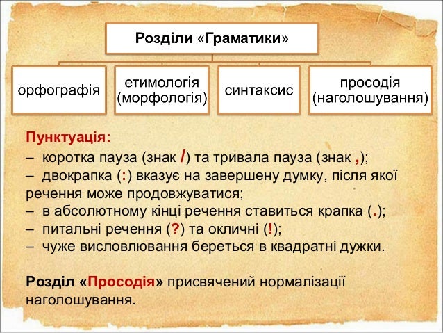 33. 33. Пунктуація: – коротка пауза (знак /) та тривала пауза (знак ,); – двокрапка (:) вказує на завершену думку, після якої речення може продовжуватися; – в абсолютному кінці речення ставиться крапка (.); – питальні речення (?) та окличні (!); – чуже висловлювання береться в квадратні дужки. Розділ «Просодія» присвячений нормалізації наголошування.