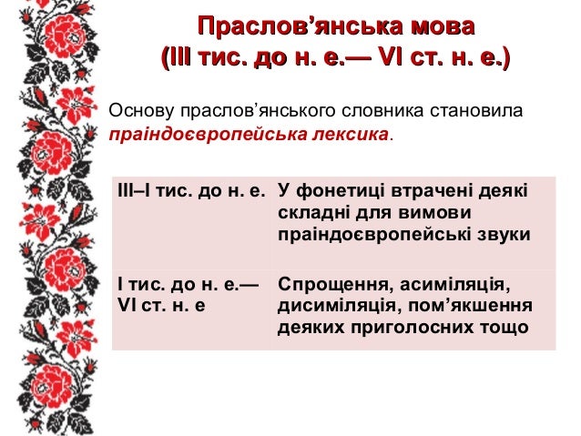 3. 3. Праслов’янська моваПраслов’янська мова (III тис. до н. е.— VІ ст. н. е.)(III тис. до н. е.— VІ ст. н. е.) Основу праслов’янського словника становила праіндоєвропейська лексика. III–I тис. до н. е. У фонетиці втрачені деякі складні для вимови праіндоєвропейські звуки I тис. до н. е.— VІ ст. н. е Спрощення, асиміляція, дисиміляція, пом’якшення деяких приголосних тощо