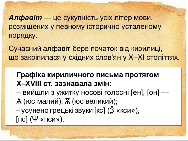 39. 39. Алфавіт — це сукупність усіх літер мови, розміщених у певному історично усталеному порядку. Сучасний алфавіт бере початок від кирилиці, що закріпилася у східних слов’ян у X–XI століттях. Графіка кириличного письма протягом X–XVIII ст. зазнавала змін: – вийшли з ужитку носові голосні [ен], [он] — (юс малий), (юс великий);Ѧ Ѫ – усунено грецькі звуки [кс] ( «кси»),Ѯ [пс] ( «пси»).Ѱ