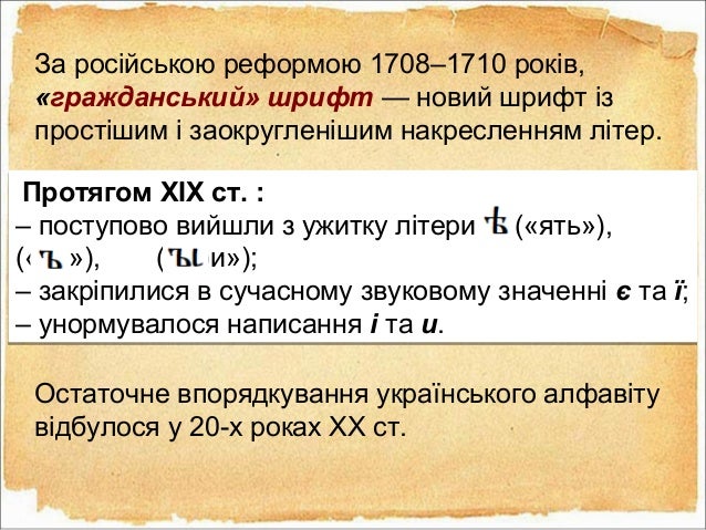 40. 40. За російською реформою 1708–1710 років, «гражданський» шрифт — новий шрифт із простішим і заокругленішим накресленням літер. Остаточне впорядкування українського алфавіту відбулося у 20-х роках XX ст. Протягом XIX ст. : – поступово вийшли з ужитку літери («ять»), («єр»), («єри»); – закріпилися в сучасному звуковому значенні є та ї; – унормувалося написання і та и. Протягом XIX ст. : – поступово вийшли з ужитку літери («ять»), («єр»), («єри»); – закріпилися в сучасному звуковому значенні є та ї; – унормувалося написання і та и.
