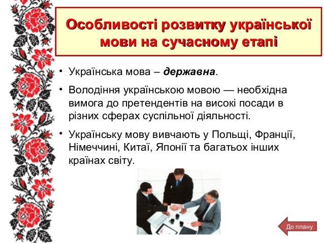41. 41. • Українська мова – державна. • Володіння українською мовою — необхідна вимога до претендентів на високі посади в різних сферах суспільної діяльності. • Українську мову вивчають у Польщі, Франції, Німеччині, Китаї, Японії та багатьох інших країнах світу. Особливості розвитку українськоїОсобливості розвитку української мови на сучасному етапімови на сучасному етапі До плану