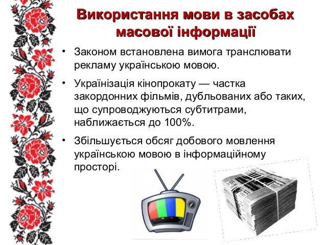 42. 42. Використання мови в засобахВикористання мови в засобах масової інформаціїмасової інформації • Законом встановлена вимога транслювати рекламу українською мовою. • Українізація кінопрокату — частка закордонних фільмів, дубльованих або таких, що супроводжуються субтитрами, наближається до 100%. • Збільшується обсяг добового мовлення українською мовою в інформаційному просторі.
