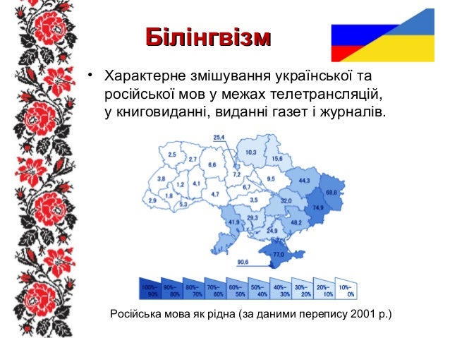43. 43. БілінгвізмБілінгвізм • Характерне змішування української та російської мов у межах телетрансляцій, у книговиданні, виданні газет і журналів. Російська мова як рідна (за даними перепису 2001 р.)