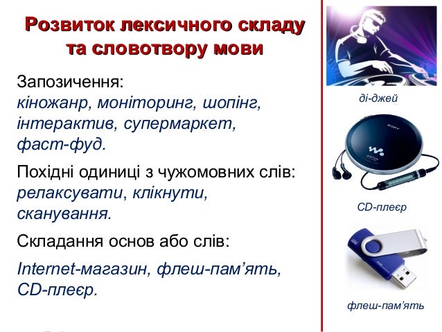 45. 45. Розвиток лексичного складуРозвиток лексичного складу та словотвору мовита словотвору мови Запозичення: кіножанр, моніторинг, шопінг, інтерактив, супермаркет, фаст-фуд. Похідні одиниці з чужомовних слів: релаксувати, клікнути, сканування. Складання основ або слів: Internet-магазин, флеш-пам’ять, CD-плеєр. флеш-пам’ять CD-плеєр ді-джей