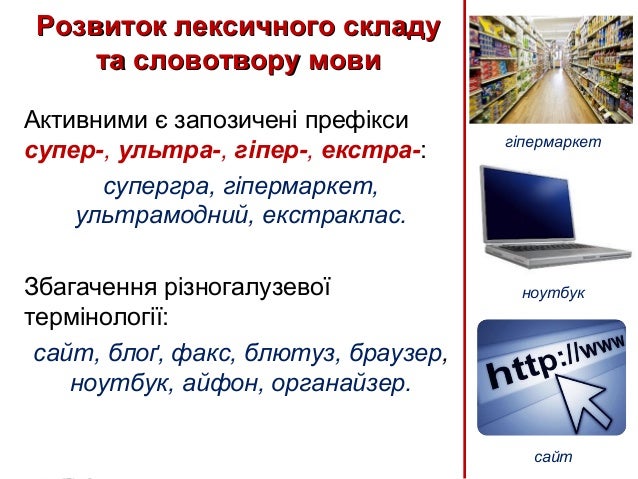 46. 46. Активними є запозичені префікси супер-, ультра-, гіпер-, екстра-: супергра, гіпермаркет, ультрамодний, екстраклас. Збагачення різногалузевої термінології: сайт, блоґ, факс, блютуз, браузер, ноутбук, айфон, органайзер. Розвиток лексичного складуРозвиток лексичного складу та словотвору мовита словотвору мови гіпермаркет ноутбук сайт