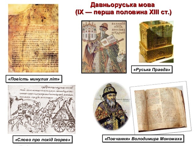 8. 8. Давньоруська моваДавньоруська мова (ІХ — перша половина ХІІІ ст.)(ІХ — перша половина ХІІІ ст.) «Повість минулих літ»«Повість минулих літ» «Руська Правда»«Руська Правда» «Слово про похід Ігорев»«Слово про похід Ігорев» «Повчання» Володимира Мономаха«Повчання» Володимира Мономаха