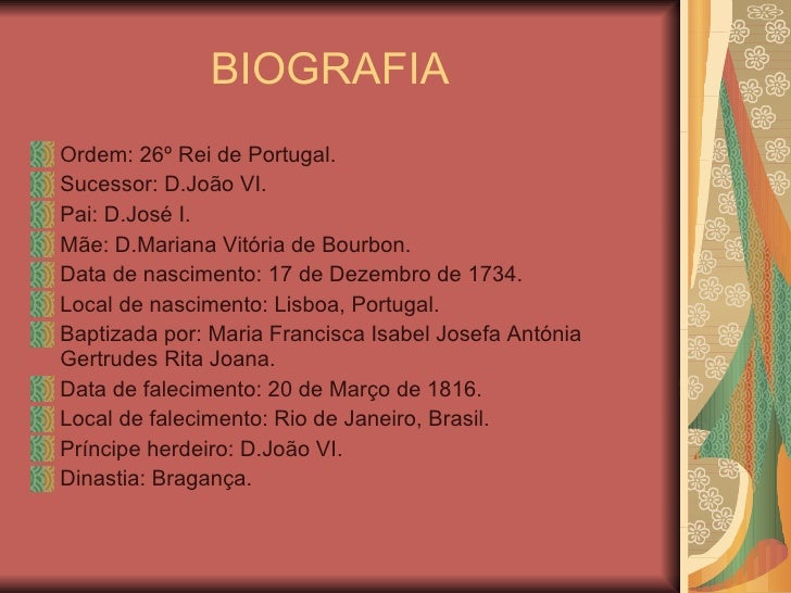 2. 2. BIOGRAFIA <ul><li>Ordem: 26º Rei de Portugal. </li></ul><ul><li>Sucessor: D.João VI. </li></ul><ul><li>Pai: D.José I. </li></ul><ul><li>Mãe: D.Mariana Vitória de Bourbon. </li></ul><ul><li>Data de nascimento: 17 de Dezembro de 1734. </li></ul><ul><li>Local de nascimento: Lisboa, Portugal. </li></ul><ul><li>Baptizada por: Maria Francisca Isabel Josefa Antónia Gertrudes Rita Joana. </li></ul><ul><li>Data de falecimento: 20 de Março de 1816. </li></ul><ul><li>Local de falecimento: Rio de Janeiro, Brasil. </li></ul><ul><li>Príncipe herdeiro: D.João VI. </li></ul><ul><li>Dinastia: Bragança. </li></ul>