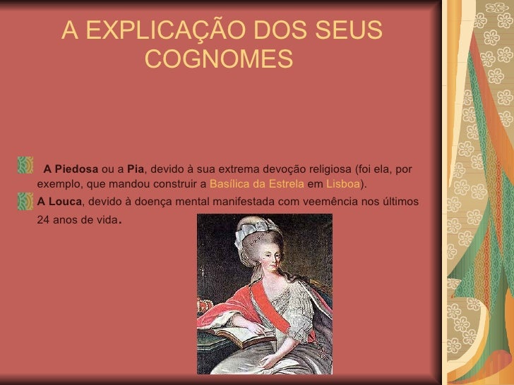 3. 3. A EXPLICAÇÃO DOS SEUS COGNOMES <ul><li>A Piedosa ou a Pia , devido à sua extrema devoção religiosa (foi ela, por exemplo, que mandou construir a Basílica da Estrela em Lisboa ). </li></ul><ul><li>A Louca , devido à doença mental manifestada com veemência nos últimos 24 anos de vida . </li></ul>