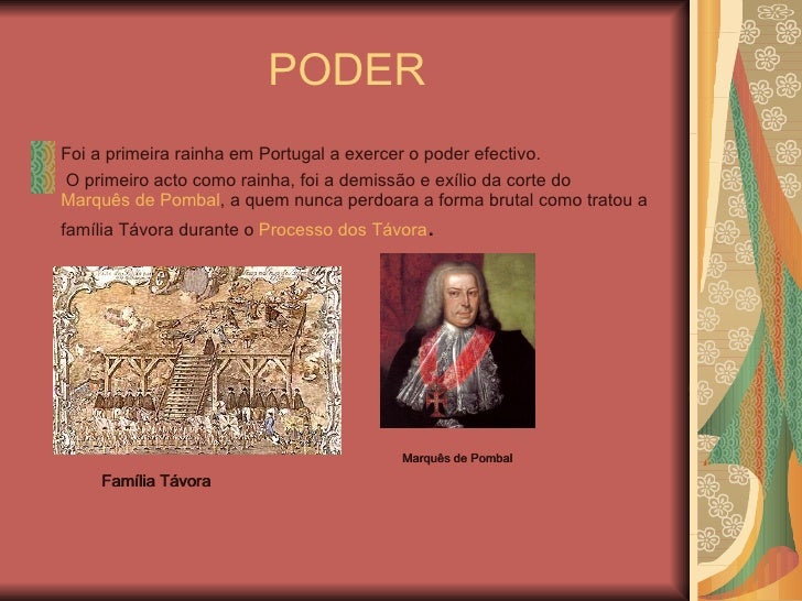 4. 4. PODER <ul><li>Foi a primeira rainha em Portugal a exercer o poder efectivo. </li></ul><ul><li>O primeiro acto como rainha, foi a demissão e exílio da corte do Marquês de Pombal , a quem nunca perdoara a forma brutal como tratou a família Távora durante o Processo dos Távora . </li></ul>Família Távora Marquês de Pombal