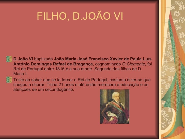 5. 5. FILHO, D.JOÃO VI <ul><li>D . João VI baptizado João Maria José Francisco Xavier de Paula Luís António Domingos Rafael de Bragança , cognominado O Clemente , foi Rei de Portugal entre 1816 e a sua morte. Segundo dos filhos de D. Maria I. </li></ul><ul><li>Triste ao saber que se ia tornar o Rei de Portugal, costuma dizer-se que chegou a chorar. Tinha 21 anos e até então merecera a educação e as atenções de um secundogênito. </li></ul>