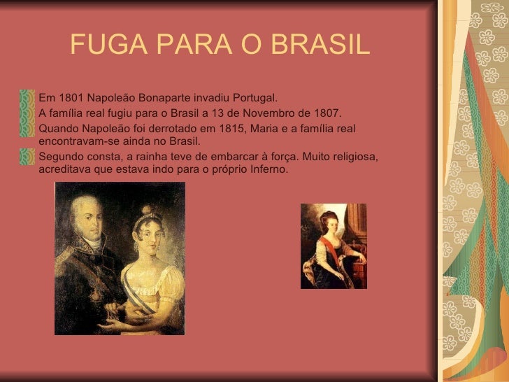 6. 6. FUGA PARA O BRASIL <ul><li>Em 1801 Napoleão Bonaparte invadiu Portugal. </li></ul><ul><li>A família real fugiu para o Brasil a 13 de Novembro de 1807. </li></ul><ul><li>Quando Napoleão foi derrotado em 1815, Maria e a família real encontravam-se ainda no Brasil. </li></ul><ul><li>Segundo consta, a rainha teve de embarcar à força. Muito religiosa, acreditava que estava indo para o próprio Inferno. </li></ul>
