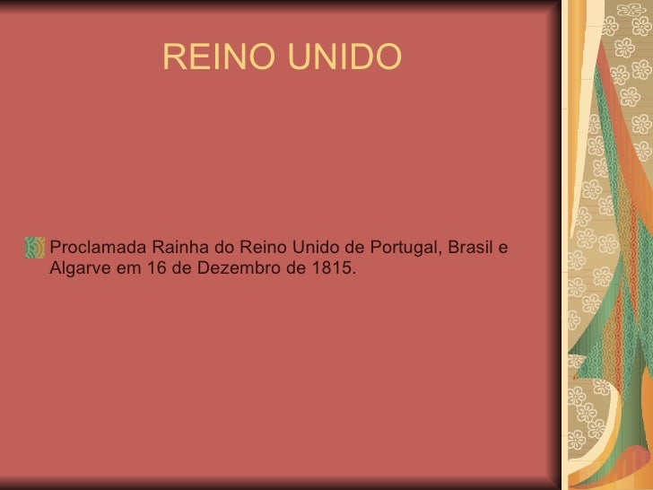 7. 7. REINO UNIDO <ul><li>Proclamada Rainha do Reino Unido de Portugal, Brasil e Algarve em 16 de Dezembro de 1815. </li></ul>