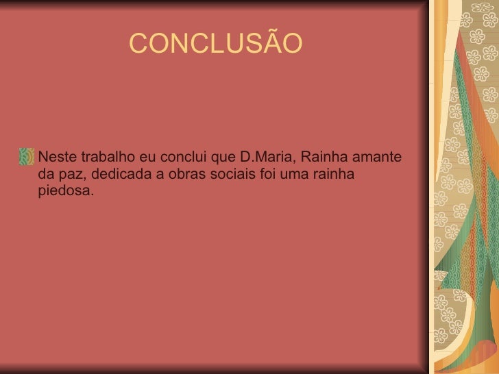 8. 8. CONCLUSÃO <ul><li>Neste trabalho eu conclui que D.Maria, Rainha amante da paz, dedicada a obras sociais foi uma rainha piedosa. </li></ul>