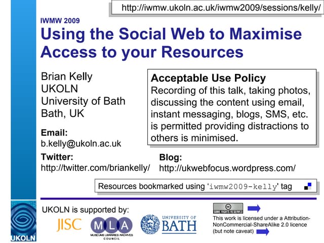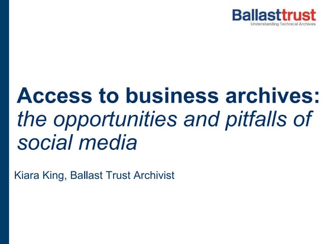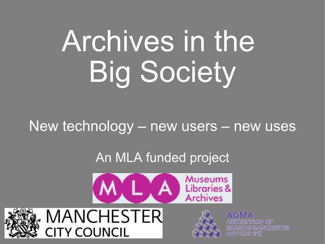 Benefits <ul><li>Web 2.0 tools give an archive: </li></ul><ul><li>Increased awareness of its collections </li></ul><ul><li>Varied access points </li></ul><ul><li>Diversification of users </li></ul><ul><li>Improved relationships & links in the sector </li></ul><ul><li>Additional information about collections </li></ul><ul><li>New dynamic ways to engage </li></ul>