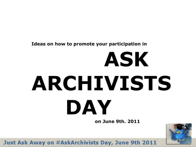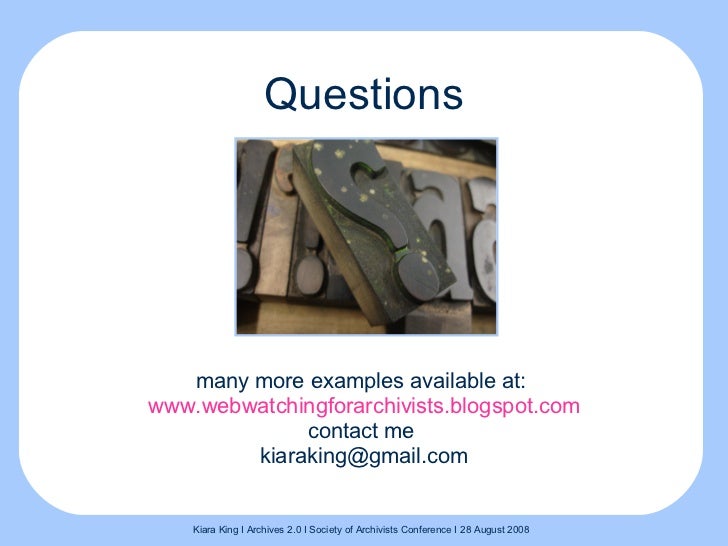 Questions <ul><li>many more examples available at: www.webwatchingforarchivists.blogspot.com </li></ul><ul><li>contact me </li></ul><ul><li>[email_address] </li></ul>