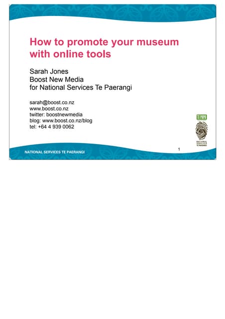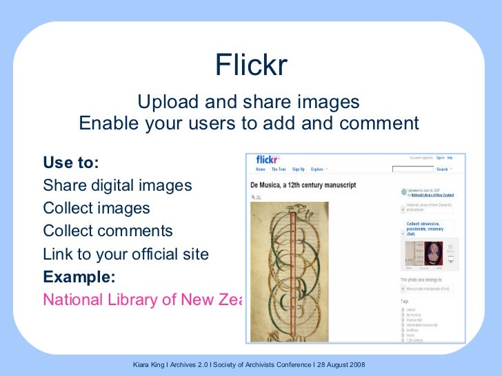 Flickr <ul><li>Use to: </li></ul><ul><li>Share digital images </li></ul><ul><li>Collect images </li></ul><ul><li>Collect comments </li></ul><ul><li>Link to your official site </li></ul><ul><li>Example: </li></ul><ul><li>National Library of New Zealand </li></ul>Upload and share images Enable your users to add and comment