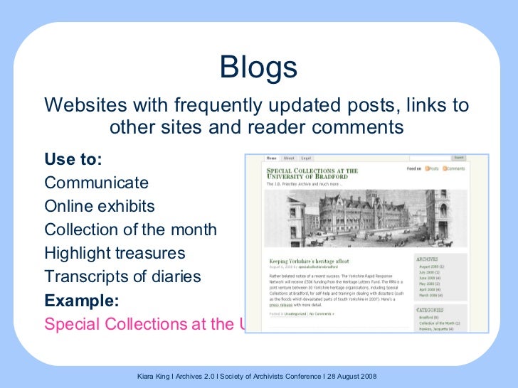 Blogs <ul><li>Use to: </li></ul><ul><li>Communicate </li></ul><ul><li>Online exhibits </li></ul><ul><li>Collection of the month </li></ul><ul><li>Highlight treasures </li></ul><ul><li>Transcripts of diaries </li></ul><ul><li>Example: </li></ul><ul><li>Special Collections at the University of Bradford </li></ul>Websites with frequently updated posts, links to other sites and reader comments