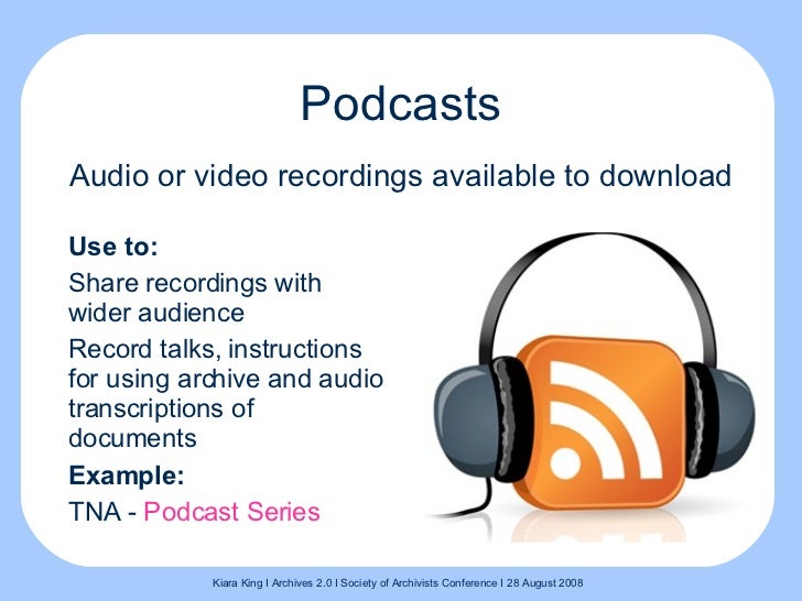 Podcasts <ul><li>Use to: </li></ul><ul><li>Share recordings with wider audience </li></ul><ul><li>Record talks, instructions for using archive and audio transcriptions of documents </li></ul><ul><li>Example: </li></ul><ul><li>TNA - Podcast Series </li></ul><ul><li>examples </li></ul>Audio or video recordings available to download