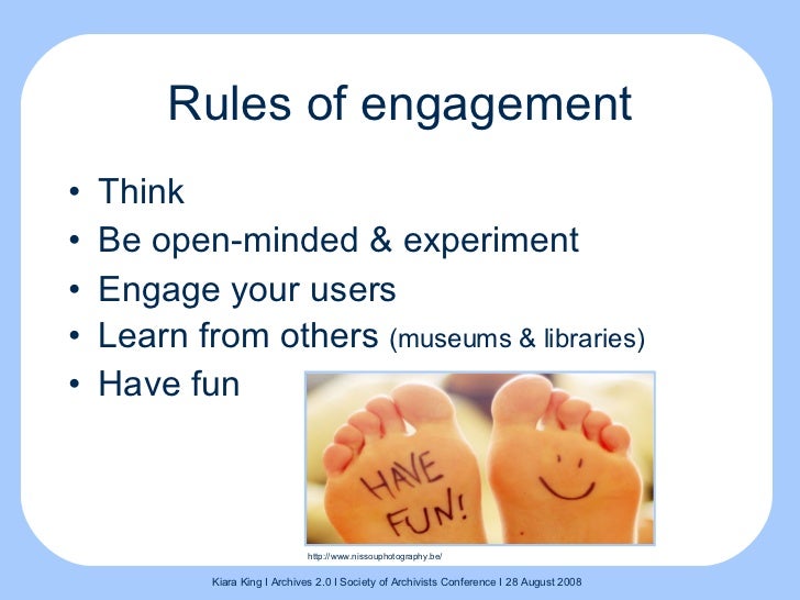 Rules of engagement <ul><li>Think </li></ul><ul><li>Be open-minded & experiment </li></ul><ul><li>Engage your users </li></ul><ul><li>Learn from others (museums & libraries) </li></ul><ul><li>Have fun </li></ul>http://www.nissouphotography.be/