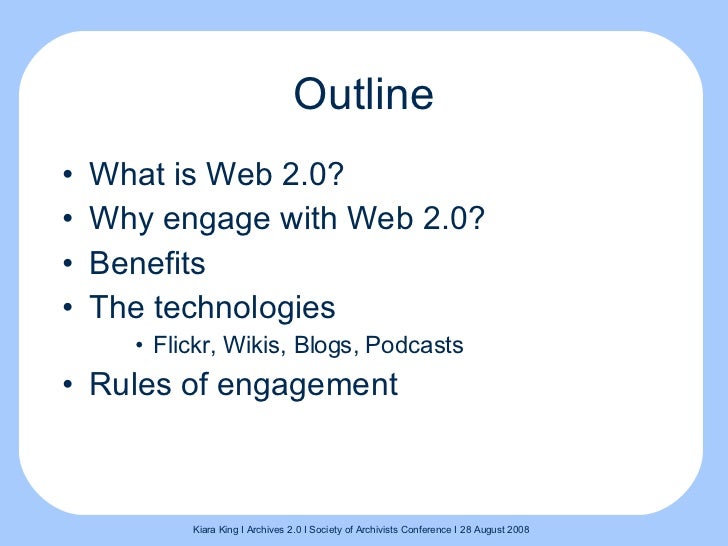 Outline <ul><li>What is Web 2.0? </li></ul><ul><li>Why engage with Web 2.0? </li></ul><ul><li>Benefits </li></ul><ul><li>The technologies </li></ul><ul><ul><ul><li>Flickr, Wikis, Blogs, Podcasts </li></ul></ul></ul><ul><li>Rules of engagement </li></ul>