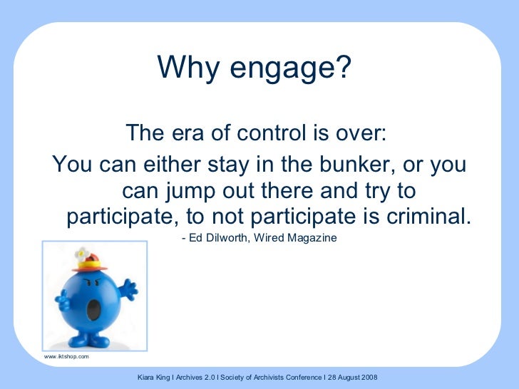 Why engage? <ul><li>The era of control is over: </li></ul><ul><li>You can either stay in the bunker, or you can jump out there and try to participate, to not participate is criminal. </li></ul><ul><li>- Ed Dilworth, Wired Magazine </li></ul>www.iktshop.com