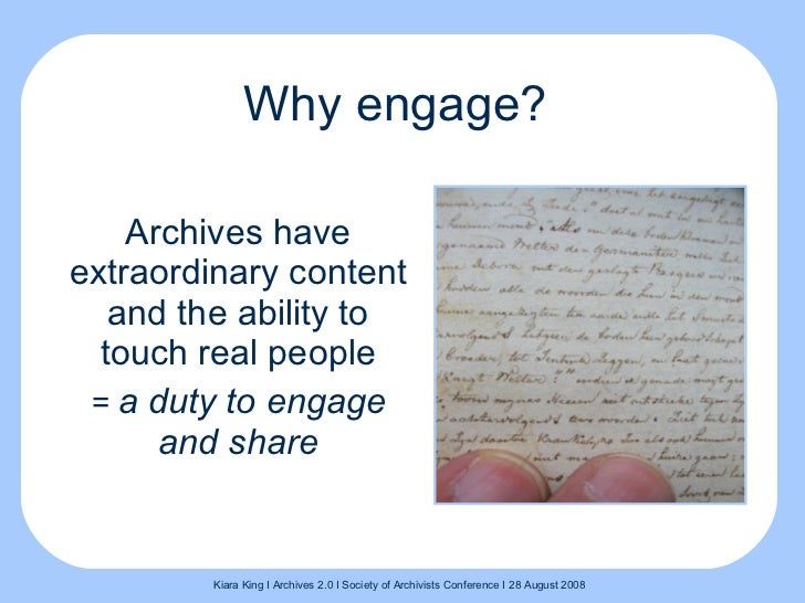 Why engage? Archives have extraordinary content and the ability to touch real people = a duty to engage and share