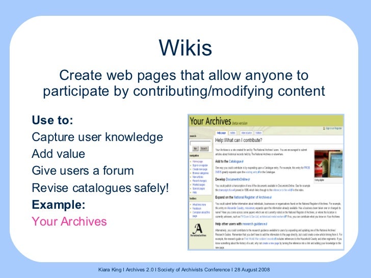 Wikis <ul><li>Use to: </li></ul><ul><li>Capture user knowledge </li></ul><ul><li>Add value </li></ul><ul><li>Give users a forum </li></ul><ul><li>Revise catalogues safely! </li></ul><ul><li>Example: </li></ul><ul><li>Your Archives </li></ul>Create web pages that allow anyone to participate by contributing/modifying content