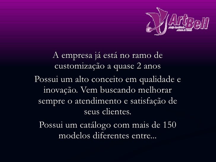 2. 2. A empresa já está no ramo de customização a quase 2 anos Possui um alto conceito em qualidade e inovação. Vem buscando melhorar sempre o atendimento e satisfação de seus clientes. Possui um catálogo com mais de 150 modelos diferentes entre...