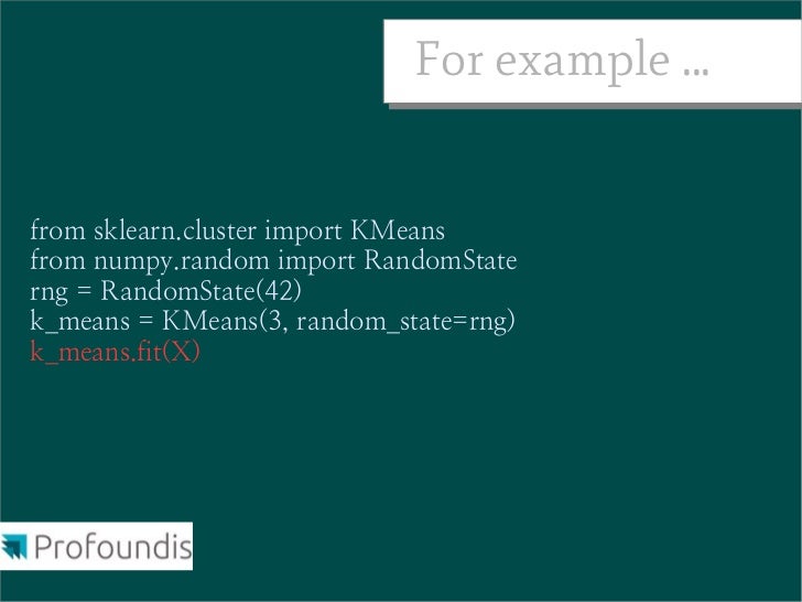 12. 12. For example ... from sklearn.cluster import KMeans from numpy.random import RandomState rng = RandomState(42) k_means = KMeans(3, random_state=rng) k_means.fit(X)