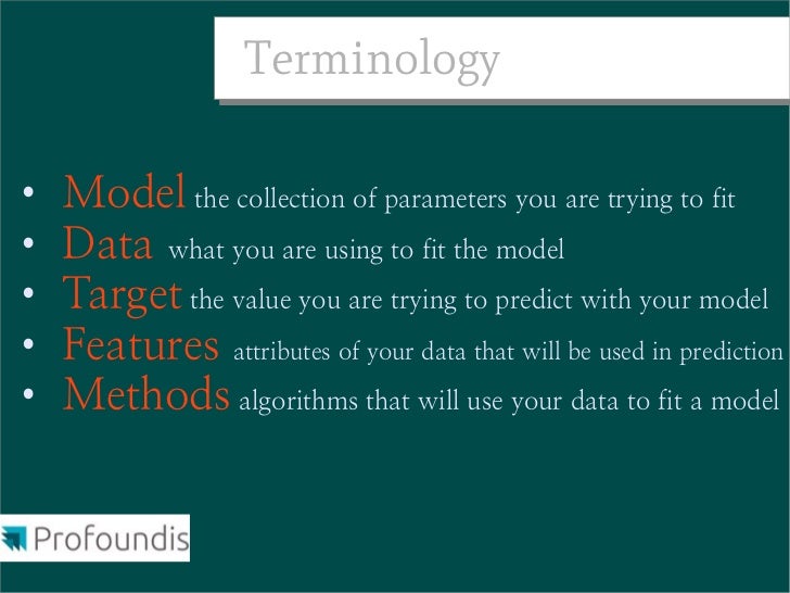 14. 14. Terminology • Model the collection of parameters you are trying to fit • Data what you are using to fit the model • Target the value you are trying to predict with your model • Features attributes of your data that will be used in prediction • Methods algorithms that will use your data to fit a model