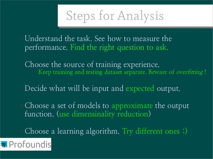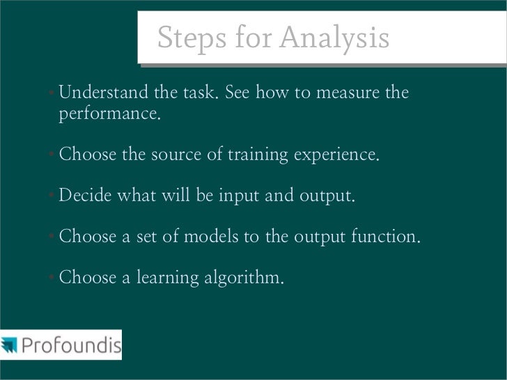 15. 15. Steps for Analysis ● Understand the task. See how to measure the performance. ● Choose the source of training experience. ● Decide what will be input and output. ● Choose a set of models to the output function. ● Choose a learning algorithm.