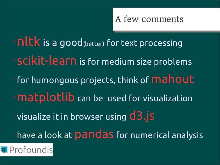 24. 24. A few comments A few comments ● nltk is a good(better) for text processing ● scikit-learn is for medium size problems ● for humongous projects, think of mahout ● matplotlib can be used for visualization ● visualize it in browser using d3.js ● have a look at pandas for numerical analysis