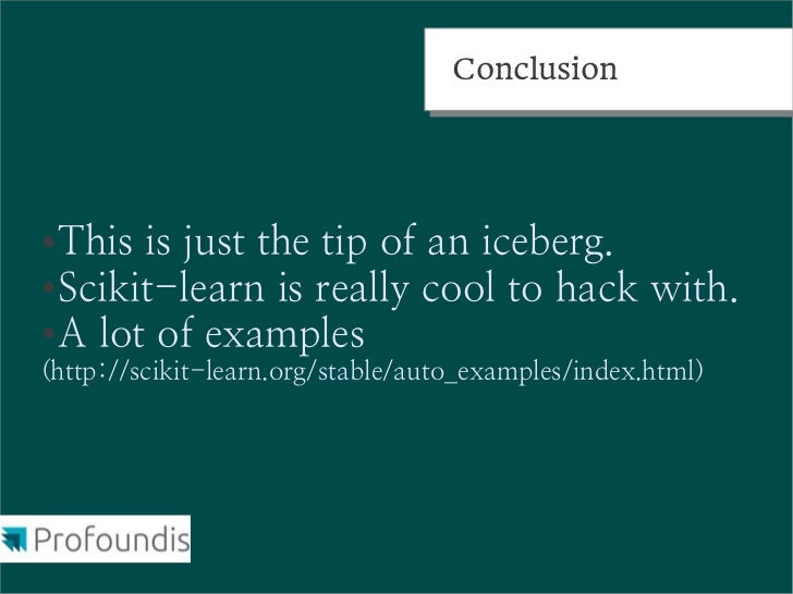 25. 25. Conclusion Conclusion ● This is just the tip of an iceberg. ● Scikit-learn is really cool to hack with. ● A lot of examples (http://scikit-learn.org/stable/auto_examples/index.html)