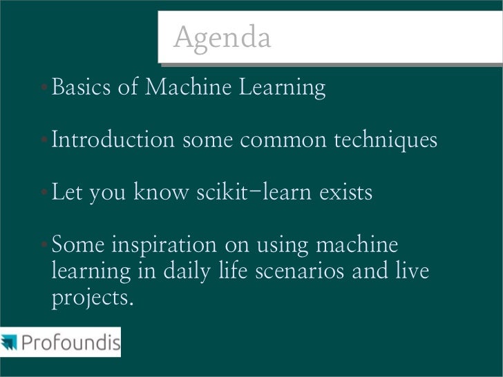 2. 2. Agenda ● Basics of Machine Learning ● Introduction some common techniques ● Let you know scikit-learn exists ● Some inspiration on using machine learning in daily life scenarios and live projects.