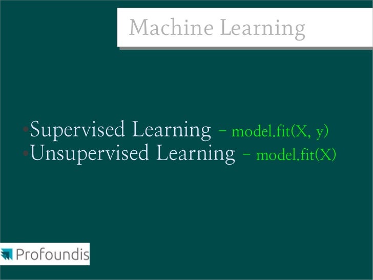 8. 8. Machine Learning ● Supervised Learning - model.fit(X, y) ● Unsupervised Learning - model.fit(X)