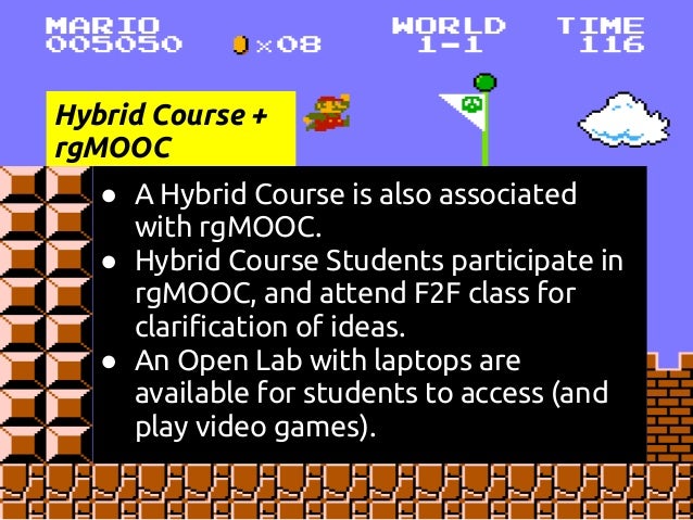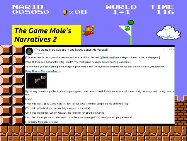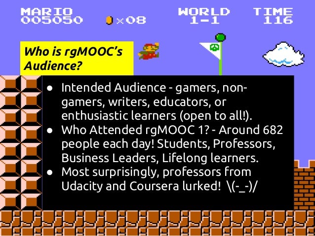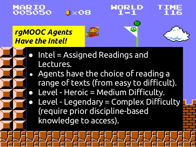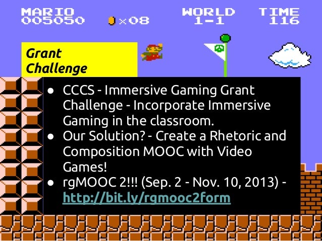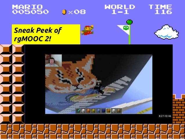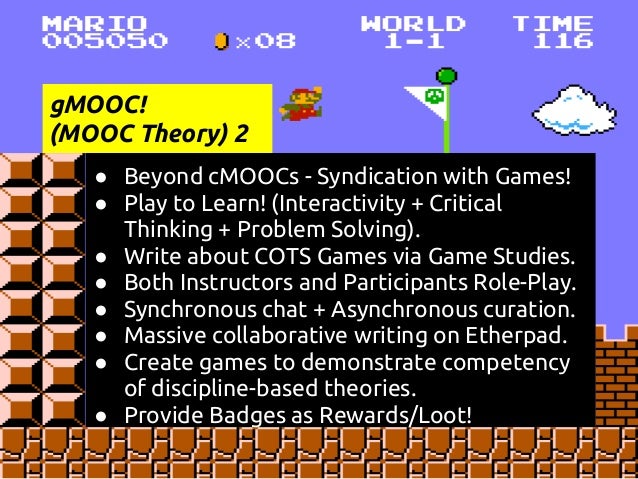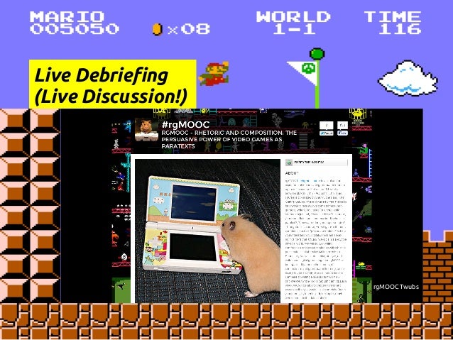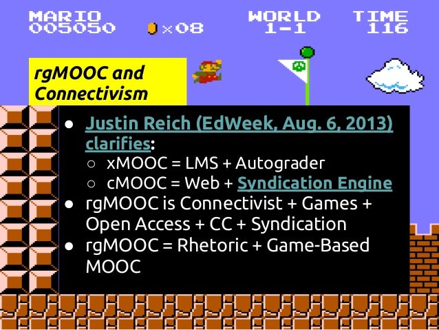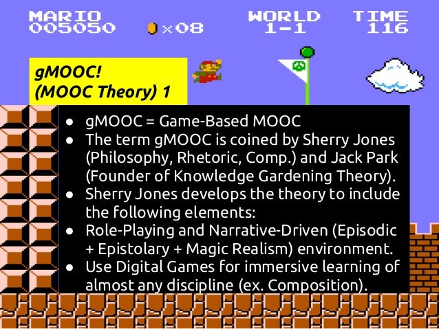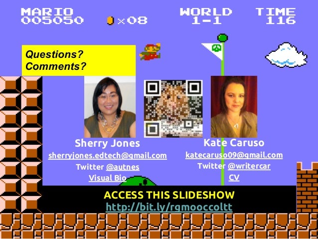 Description: This is a presentation at the COLTT 2013 conference on rgMOOC, or "Rhetoric and Composition: The Persuasive Power of Video Games as Paratexts." rgMOOC is a type of gMOOC, or game-based MOOC. gMOOC is a term coined by Sherry Jones and Jack Park. This presentation details Sherry's development of the gMOOC theory and how the theory is implemented in the UX design of rgMOOC, as well as Kate's method of teaching Writing Composition via Youtube, Twitter, and other Web 2.0 tools.