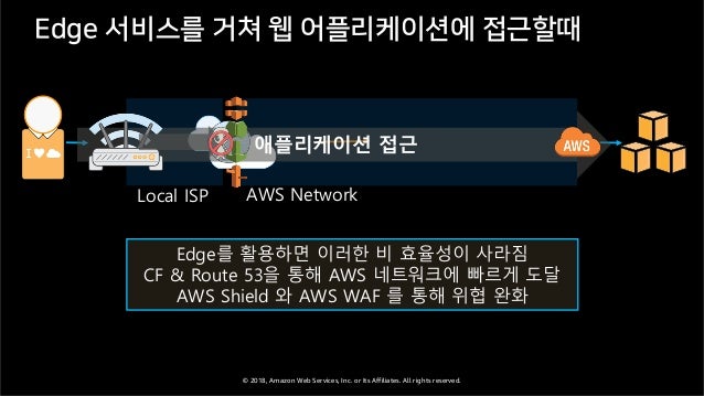10. 10. © 2018, Amazon Web Services, Inc. or Its Affiliates. All rights reserved. Local ISP 애플리케이션 접근 Edge를 활용하면 이러한 비 효율성이 사라짐 CF & Route 53을 통해 AWS 네트워크에 빠르게 도달 AWS Shield 와 AWS WAF 를 통해 위협 완화 AWS Network