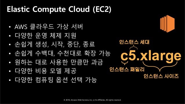 16. 16. © 2018, Amazon Web Services, Inc. or Its Affiliates. All rights reserved. Elastic Compute Cloud (EC2) • AWS 클라우드 가상 서버 • 다양한 운영 체제 지원 • 손쉽게 생성, 시작, 중단, 종료 • 손쉽게 수백대, 수천대로 확장 가능 • 원하는 대로 사용한 만큼만 과금 • 다양한 비용 모델 제공 • 다양한 컴퓨팅 옵션 선택 가능 인스턴스 세대 인스턴스 패밀리 인스턴스 사이즈 c5.xlarge