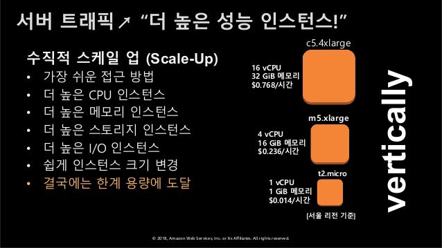 17. 17. © 2018, Amazon Web Services, Inc. or Its Affiliates. All rights reserved. 서버 트래픽↗ “더 높은 성능 인스턴스!” 수직적 스케일 업 (Scale-Up) • 가장 쉬운 접근 방법 • 더 높은 CPU 인스턴스 • 더 높은 메모리 인스턴스 • 더 높은 스토리지 인스턴스 • 더 높은 I/O 인스턴스 • 쉽게 인스턴스 크기 변경 • 결국에는 한계 용량에 도달 vertically 1 vCPU 1 GiB 메모리 $0.014/시간 t2.micro m5.xlarge 4 vCPU 16 GiB 메모리 $0.236/시간 c5.4xlarge 16 vCPU 32 GiB 메모리 $0.768/시간 [서울 리전 기준]
