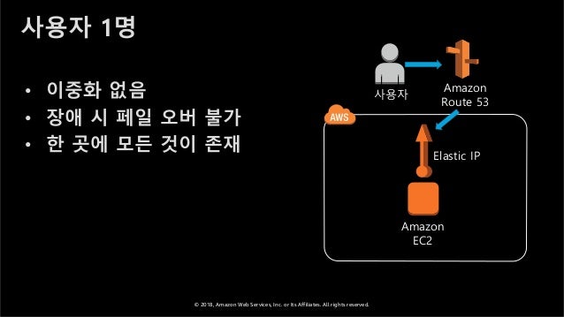 18. 18. © 2018, Amazon Web Services, Inc. or Its Affiliates. All rights reserved. 사용자 1명 • 이중화 없음 • 장애 시 페일 오버 불가 • 한 곳에 모든 것이 존재 Elastic IP Amazon Route 53 사용자 Amazon EC2