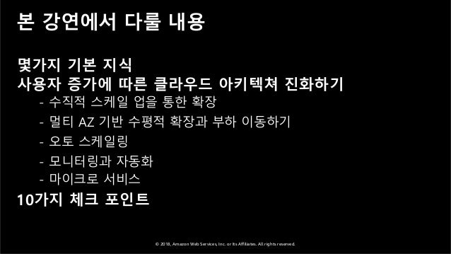 2. 2. © 2018, Amazon Web Services, Inc. or Its Affiliates. All rights reserved. 본 강연에서 다룰 내용 몇가지 기본 지식 사용자 증가에 따른 클라우드 아키텍쳐 진화하기 - 수직적 스케일 업을 통한 확장 - 멀티 AZ 기반 수평적 확장과 부하 이동하기 - 오토 스케일링 - 모니터링과 자동화 - 마이크로 서비스 10가지 체크 포인트
