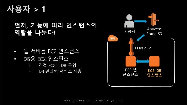 20. 20. © 2018, Amazon Web Services, Inc. or Its Affiliates. All rights reserved. 사용자 > 1 EC2 DB 인스턴스 Amazon Route 53 사용자 EC2 웹 인스턴스 Elastic IP 먼저, 기능에 따라 인스턴스의 역할을 나눈다! • 웹 서버용 EC2 인스턴스 • DB용 EC2 인스턴스 • 직접 EC2에 DB 운영 • DB 관리형 서비스 사용