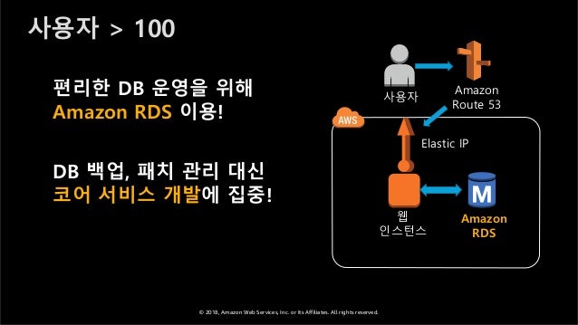 22. 22. © 2018, Amazon Web Services, Inc. or Its Affiliates. All rights reserved. 사용자 > 100 편리한 DB 운영을 위해 Amazon RDS 이용! DB 백업, 패치 관리 대신 코어 서비스 개발에 집중! Amazon Route 53 사용자 웹 인스턴스 Elastic IP Amazon RDS