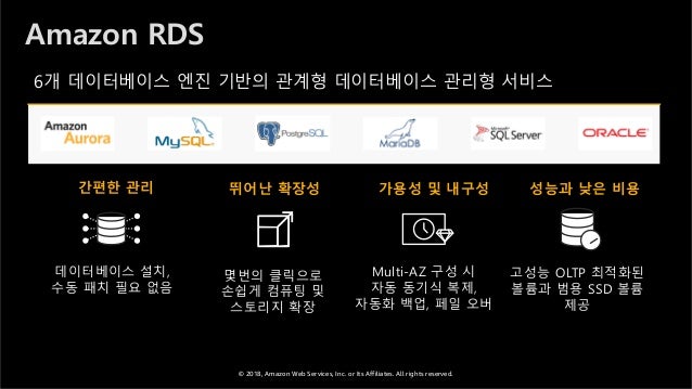 23. 23. © 2018, Amazon Web Services, Inc. or Its Affiliates. All rights reserved. Amazon RDS 6개 데이터베이스 엔진 기반의 관계형 데이터베이스 관리형 서비스 간편한 관리 뛰어난 확장성 가용성 및 내구성 성능과 낮은 비용 데이터베이스 설치, 수동 패치 필요 없음 몇번의 클릭으로 손쉽게 컴퓨팅 및 스토리지 확장 Multi-AZ 구성 시 자동 동기식 복제, 자동화 백업, 페일 오버 고성능 OLTP 최적화된 볼륨과 범용 SSD 볼륨 제공
